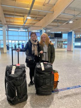 Torsdag gik turen til Idrættens Hus i Brøndby, hvor det danske hold blev samlet af DIF. På billedet ses Camilla og hendes træner Kristín Helga Hafbórsdóttir i Aalborg Lufthavn.