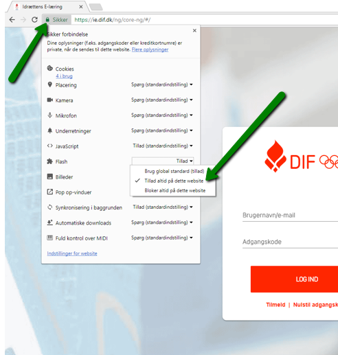 Vær opmærksom på, at systemet på et tidspunkt vil nævne, at du enten skal opdatere dit Adobe Flash eller give tilladelse til det. I Google Chrome giver du tilladelse ved at følge anvisninger på det nedenstående billede. Du kan alternativt finde den nyeste udgave af Adobe Flash her: https://get.adobe.com/flashplayer/